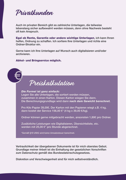 Ich kann dir helfen Ordnung zu schaffen. Ich sortiere die Unterlagen, richte eine Ordner-Struktur ein, damit zukünftig alle Dokumente schnell gefunden werden. Gerne kann ich die Unterlagen auf Wunsch auch digitalisieren und/oder archivieren.